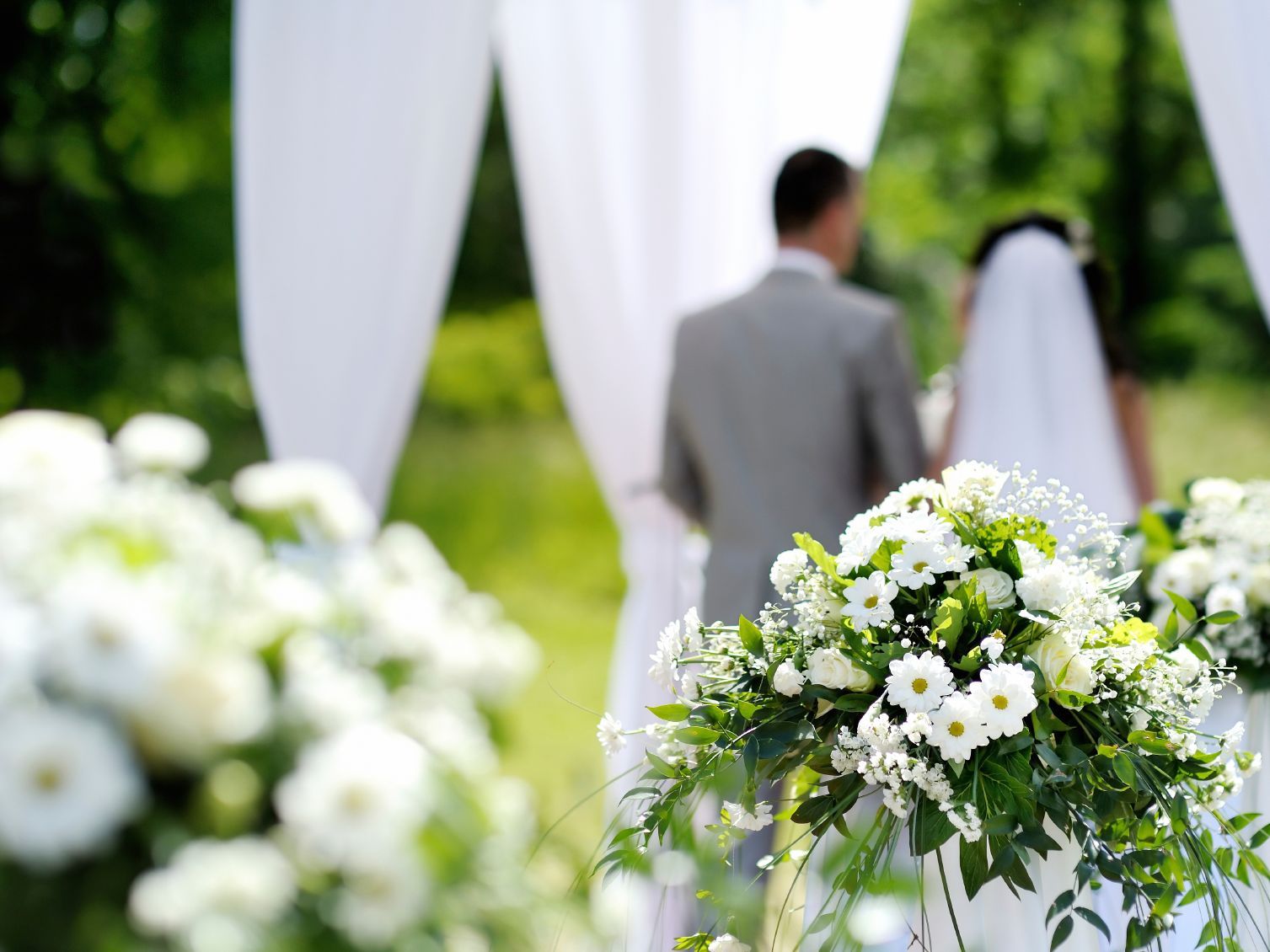 The young bride and groom have wished for an exuberant wedding celebration in a large circle. Our in-house party service has transformed our large hall into a dream made of white and green silk. A very special kind of experience!